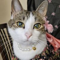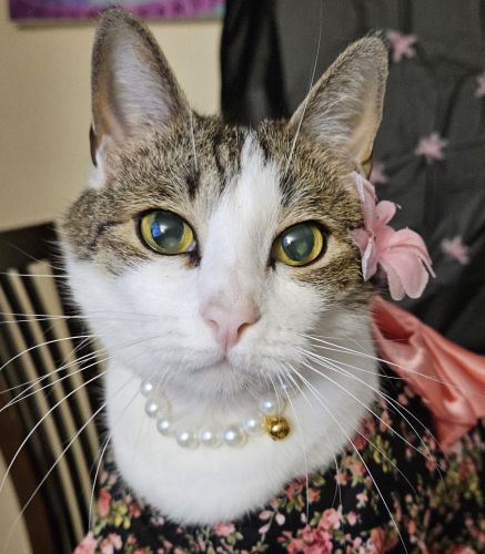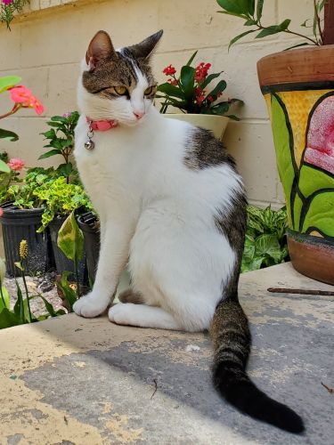 Breed : american shorthairSex : femaleSpayed : yesAge : 5-10 yearsWeight : 6 to 10 lbs.Size : mediumColor : light white+ medium brown+ dark blackPattern : MackerelCollar : yesCollar Type : otherTag : noTattoo/Microchip : 985141002062021 Brown spot on right hind legEye Color : light yellowEar Size : smallEar Shape : normal shapeNose Color : pinkTail Length : mediumTail Shape : curvedCoat : short hairOther : She has cloudy/"Florida" spots on eyes, was lost with a fake diamond and pearl necklace, has mixed pink and black toe beans, responds to Baby-girl and Chica Babe. Was last seen the night of June 7th 2025.