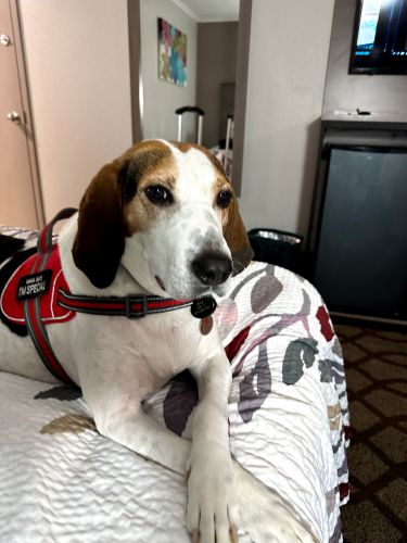 Breed : english foxhoundSex : maleSpayed : yesAge : 5-10 yearsWeight : 61 to 70 lbs.Size : largeColor : light white+ medium brown+ medium blackPattern : SpottedCollar : yesCollar Color : redCollar Type : harnessTag : noTattoo/Microchip : N/AEye Color : dark brownEar Size : mediumEar Shape : floppyNose Color : blackTail Shape : curvedHow Tail Carried : tip curls upCoat : shortOther : Harness reads “My Momma thinks I’m special.”