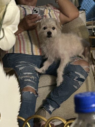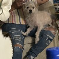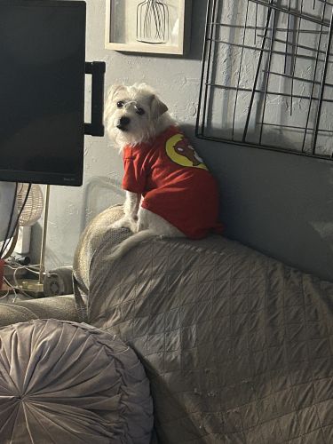 Breed : chihuahua, other/unknownSex : maleSpayed : noAge : 2-5 yearsWeight : 11 to 20 lbs.Size : smallColor : medium white+ medium tanCollar : noTattoo/Microchip : 985141003320093Eye Color : dark brownEar Size : smallEar Shape : otherNose Color : blackTail Shape : curvedHow Tail Carried : tip curls upCoat : mediumOther : Birthmark in right ear