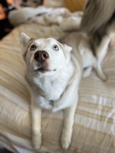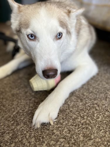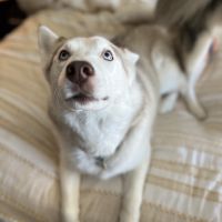 Breed : siberian huskySex : femaleAge : 5-10 yearsWeight : 41 to 50 lbs.Size : mediumColor : light white+ light brownPattern : MixedCollar : yesCollar Color : redCollar Type : canvasTattoo/Microchip : 981020025061434Eye Color : light blueEar Size : largeEar Shape : erectNose Color : brownTail Shape : straightCoat : medium