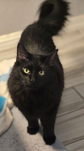 Breed : american longhairSex : femaleSpayed : yesAge : 2-5 yearsWeight : 6 to 10 lbs.Size : mediumColor : dark black+ light brownPattern : SolidCollar : noTattoo/Microchip : 985113005536907Eye Color : medium yellowEar Size : mediumEar Shape : normal shapeNose Color : blackTail Length : longTail Shape : fluffyCoat : long hair