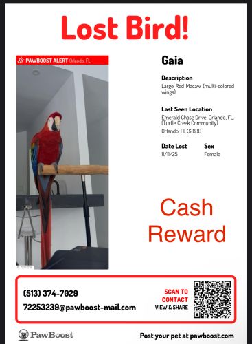 Breed : macawSex : femaleAge : 5-10 yearsWeight : 2 lbs.Color : medium scarlet-red+ medium blue+ medium greenish-yellowOther : Gaia is a Red Scarlet Macaw with multi-colored (Blue, Green and Yellow) wings. Last seen 11/11/2025 in Dr. Phillips, Orlando. Call/ text if you have her or seen her. Also please share my post.