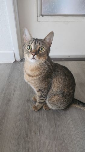 Breed : american shorthair, other/unknownSex : maleSpayed : yesAge : 18-24 monthsWeight : 6 to 10 lbs.Size : smallColor : light brown+ light black+ creamPattern : StripedCollar : noTag : noEye Color : dark greenEar Size : smallEar Shape : tips pointedNose Color : same as coatTail Length : longTail Shape : straightCoat : short hair