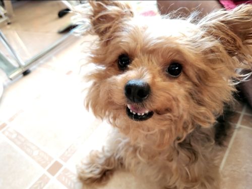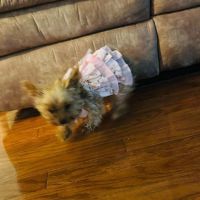Breed : yorkshire terrierSex : femaleSpayed : unkAge : 5-10 yearsSize : smallColor : light brown+ light blackPattern : StreaksCollar : noTag : noOther : Was last seen wearing a pink dress