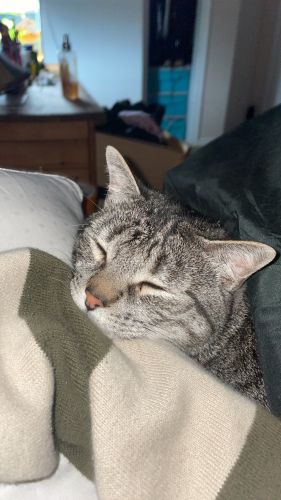 Breed : unknown breedSex : maleSpayed : yesAge : 2-5 yearsWeight : 11 to 15 lbs.Size : mediumColor : medium gray+ medium blackPattern : StripedCollar : noTattoo/Microchip : 985141007136613Eye Color : medium greenNose Color : pinkTail Length : mediumTail Shape : straightCoat : short hair