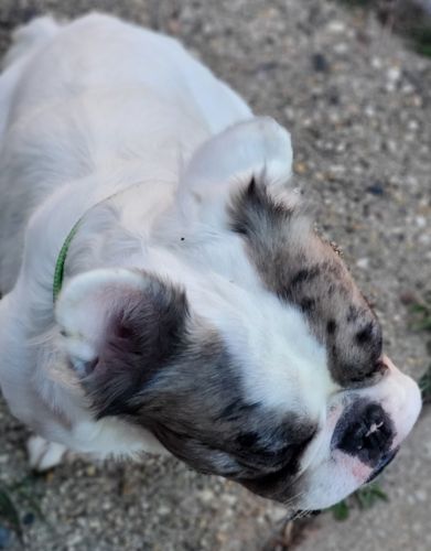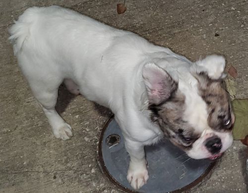 Breed : french bulldogSex : maleSpayed : noAge : 2-5 yearsSize : mediumColor : white+ medium gray+ medium brindlePattern : Separate Color ZonesCollar : noTag : noTail Shape : corkscrewCoat : mediumOther : He has a grayish brindle phantom mask one of his ears is snip at the tip an he has different color eyes