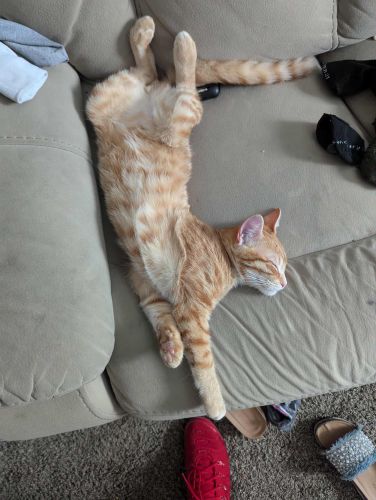 Sex : maleSpayed : noAge : 6-18 monthsWeight : 1 to 5 lbs.Size : smallColor : medium orange+ light white+ light blondPattern : StripedCollar : noEye Color : medium copperNose Color : pinkTail Length : mediumTail Shape : straightCoat : short hairOther : He’s lighter on his tummy not neutered as of lost date very vocal and affectionate, he is striped and has cheetah like spots on his fur.