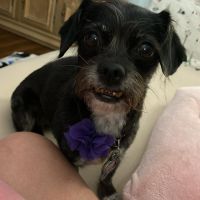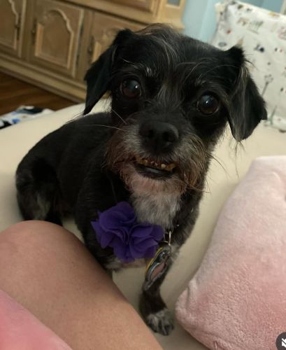Breed : cairn terrier, chihuahuaSpayed : yesAge : over 10 yearsWeight : less than 10 lbs.Color : dark black+ light grayCollar : yesCollar Color : redCollar Type : nylonTag : yesTag Type : ownerTattoo/Microchip : Microchip #31964587Eye Color : dark blackEar Size : mediumEar Shape : floppyNose Color : blackTail Shape : straightHow Tail Carried : straight behindCoat : shortOther : Skittish, nervous, tendency to run away from new people especially men. Sweet, will bark but not bite.