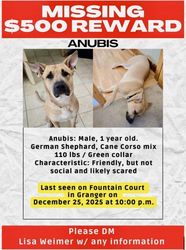 Breed : german shepherd, cane corsoSex : maleSpayed : yesAge : 6-18 monthsWeight : 101 to 110 lbs.Size : largeColor : medium tanCollar : yesCollar Color : greenTattoo/Microchip : 24PetWatch- 941010004096505