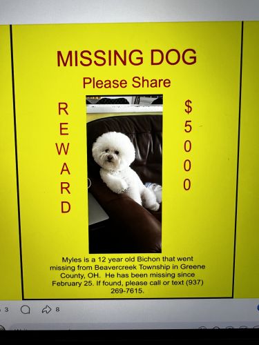 Breed : bichon friseSex : maleSpayed : yesAge : over 10 yearsWeight : 11 to 20 lbs.Size : smallColor : whitePattern : SolidEye Color : dark blackEar Size : smallEar Shape : floppyNose Color : fleshTail Shape : curvedHow Tail Carried : downCoat : mediumOther : Myles is an all white, 12 year old, neutered male, Bichon who is missing quite a few teeth. He can be friendly or aloof, depending on his mood.