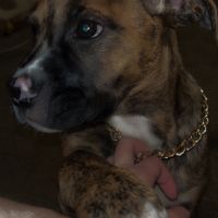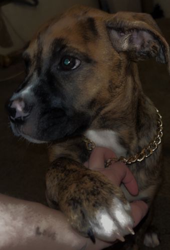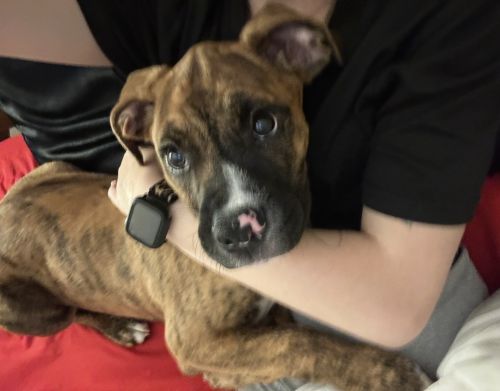 Breed : boxer, bulldogSex : maleSpayed : unkAge : 18-24 monthsWeight : 21 to 30 lbs.Size : mediumColor : dark brindlePattern : MixedCollar : yesCollar Color : blueCollar Type : otherTag : noEye Color : dark brownEar Size : mediumEar Shape : floppyNose Color : otherTail Shape : curvedHow Tail Carried : tip curls upCoat : shortOther : BLAZE has a pinkish spotted birthmark on his nose, white and black nails on his paws and a white spot on his chest and top of his nose. 🐾
