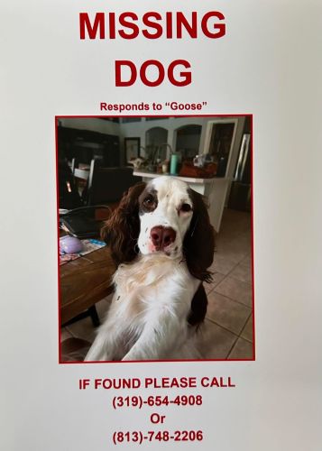 Breed : english springer spanielSex : maleSpayed : yesAge : 18-24 monthsWeight : 41 to 50 lbs.Size : mediumColor : white+ brownPattern : Separate Color ZonesCollar : yesCollar Color : redCollar Type : nylonTag : yesTag Type : otherTattoo/Microchip : 991001911513762Eye Color : dark goldEar Size : largeEar Shape : floppyNose Color : brownTail Shape : dockedHow Tail Carried : straight behindCoat : mediumOther : Goose has a half white and half brown face