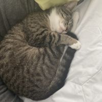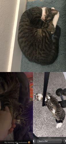 Breed : american shorthairSex : maleSpayed : noAge : 2-5 yearsSize : mediumCollar : noTag : noOther : He has a little white patch on the side of hose nose and white paws kinda like angle socks on front paws
