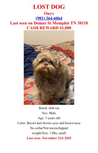 Breed : shih tzuSex : maleSpayed : unkAge : 2-5 yearsWeight : 11 to 20 lbs.Size : smallColor : light brown+ medium brownPattern : ShadedCollar : noEye Color : light brownEar Size : smallEar Shape : floppyNose Color : brownTail Shape : curvedHow Tail Carried : tip curls upCoat : longOther : Onyx is small sized brown shih tzu. He vanished from Domar St 38118 on November 21st, 2025, I know someone has him but I'm still hopeful that we will see each other again. I miss him to pieces.