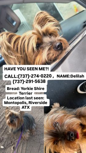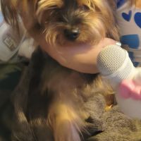 Breed : yorkshire terrierSex : femaleSpayed : unkAge : 5-10 yearsWeight : 11 to 20 lbs.Size : smallColor : gray+ blond