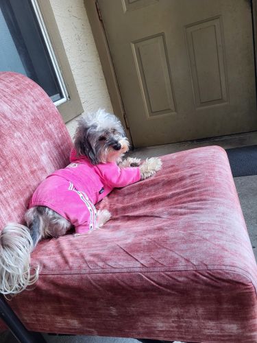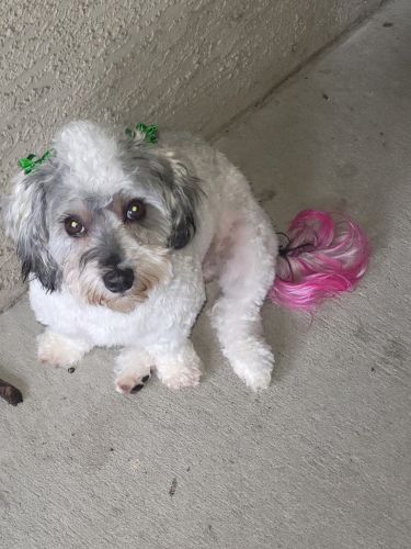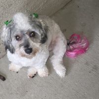Breed : yorkshire terrier, malteseSex : femaleSpayed : noAge : 18-24 monthsWeight : 11 to 20 lbs.Size : smallColor : medium white+ medium grayCollar : noTag : noEye Color : light brownEar Size : smallEar Shape : floppyNose Color : blackCoat : medium