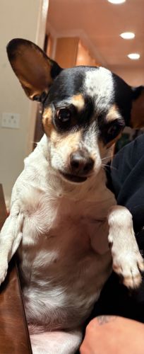 Breed : rat terrierSex : femaleSpayed : yesAge : 5-10 yearsWeight : 11 to 20 lbs.Size : smallColor : white+ blackPattern : SpottedEye Color : dark blackEar Size : mediumEar Shape : otherNose Color : blackHow Tail Carried : otherCoat : short