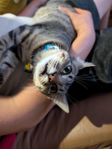Breed : unknown breedSex : femaleSpayed : yesAge : 6-18 monthsWeight : 6 to 10 lbs.Size : smallColor : gray+ blackPattern : StripedCollar : yesCollar Color : blueCollar Type : choke chainTag : noTattoo/Microchip : MicrochipEye Color : dark yellowEar Size : mediumEar Shape : normal shapeNose Color : pinkTail Length : shortTail Shape : straightCoat : short hair