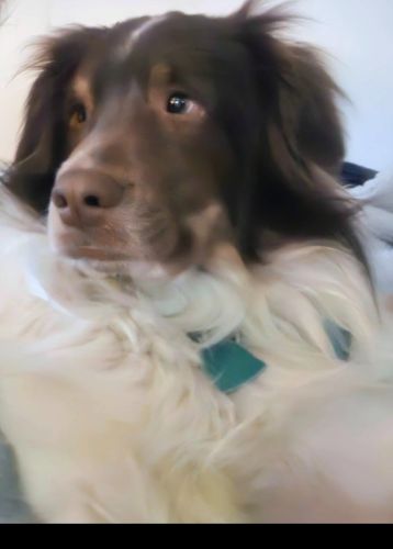 Breed : australian shepherd, border collieSex : maleSpayed : noAge : 2-5 yearsWeight : 41 to 50 lbs.Size : mediumColor : light white+ medium brown+ light blondPattern : SpottedCollar : yesCollar Color : redCollar Type : canvasTag : yesTag Type : ownerEye Color : light hazelEar Size : mediumEar Shape : floppyNose Color : brownTail Shape : curvedHow Tail Carried : tip curls upCoat : longOther : He has a white oblong heart on his head going in-between hos eyes very scared of Loud noises more comfortable with females has tummy issues requires special diet please help