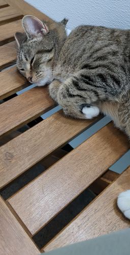 Sex : femaleSpayed : yesAge : 6-18 monthsSize : mediumColor : gray+ whitePattern : StripedCollar : noTag : noTattoo/Microchip : microchip