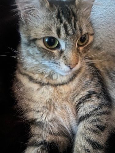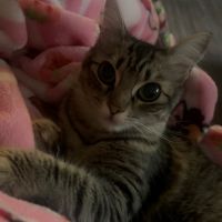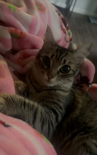 Breed : unknown breed, american shorthairSex : femaleSpayed : noAge : 2-5 yearsWeight : 6 to 10 lbs.Size : mediumColor : silver+ black+ whitePattern : StripedCollar : noEye Color : other-mediumEar Size : smallEar Shape : tips pointedNose Color : pinkCoat : short hairOther : Azul is a 2yr old tabby cat, she is grey with black strips her belly is an off-white color, black paws she will also respond to Azulita, she can be shy around people she doesn't know.